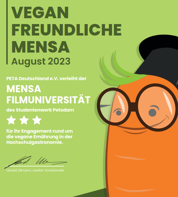 2023 wurde das Angebot in unseren Mensen zum dritten Mal von PETA als veganfreundlich ausgezeichnet.